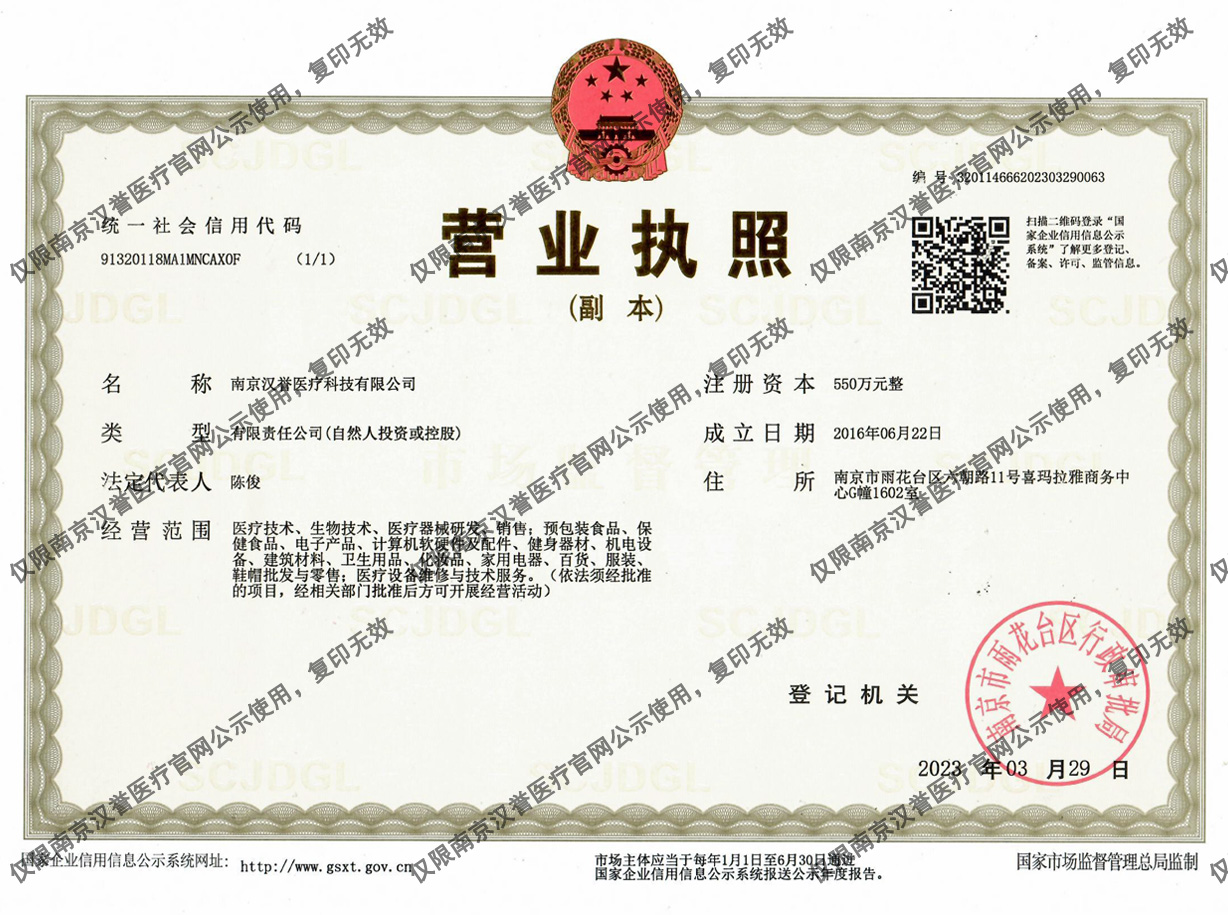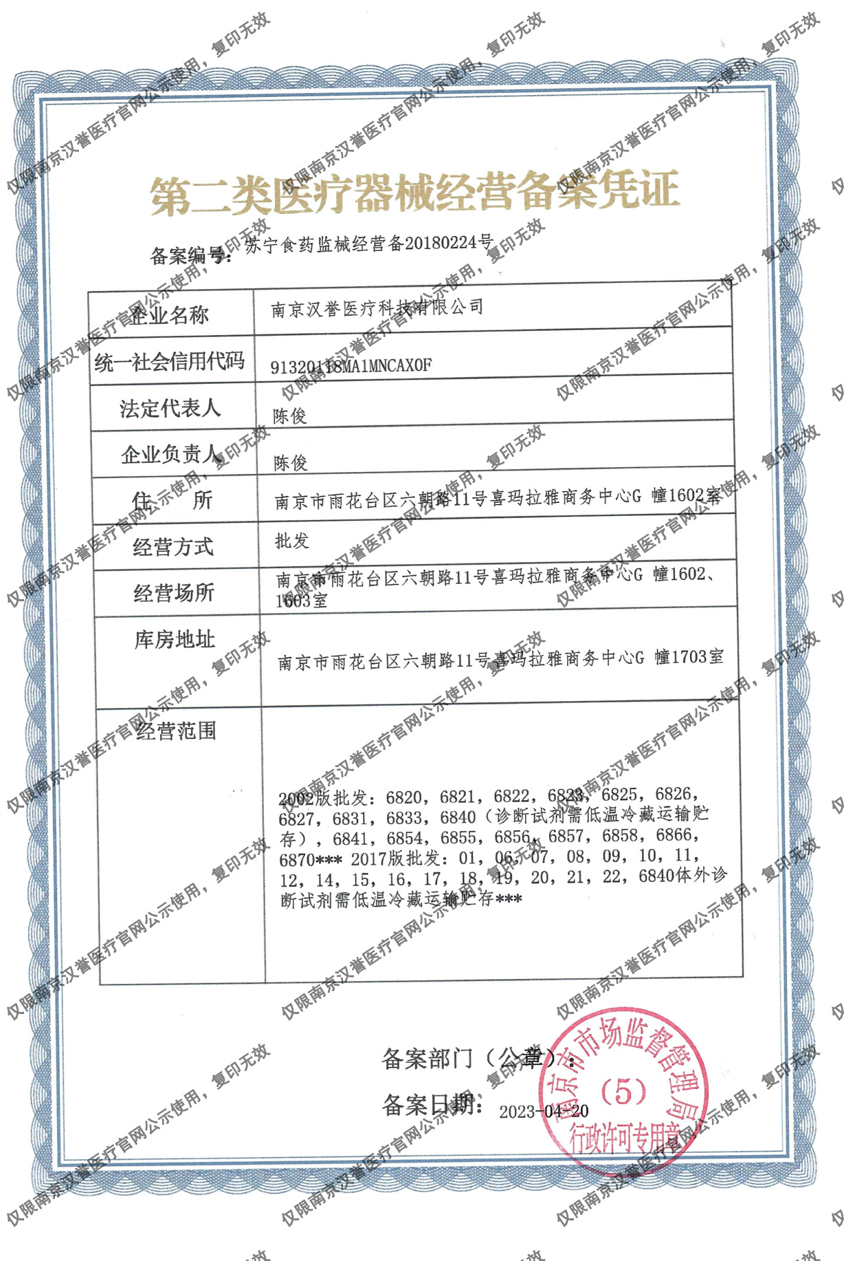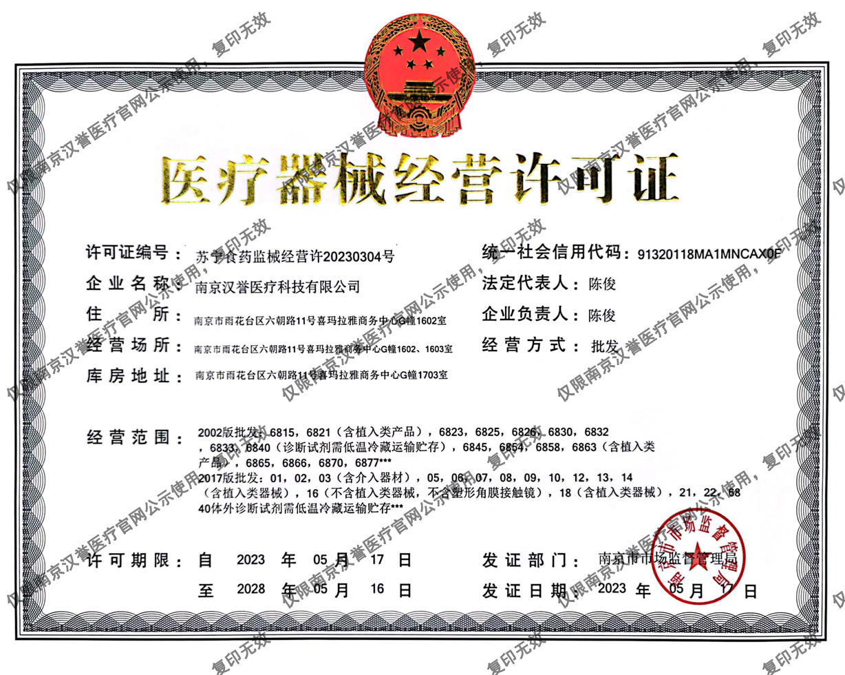 醫療器械經營許可證:蘇寧食藥監械經營許20230304號