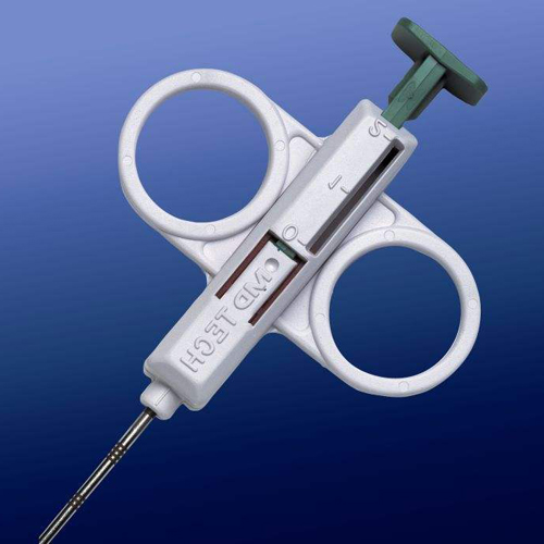 特點:輕巧、緊湊,自撐力強,可單手操作,快速準確;鋒利的外管邊沿有助于保障組織的完好無損;針尖在超聲圖像下可視性強;切割組織時,管芯針不移動;針尖斜面鋒利,扎入時快速簡便,對器官及周圍組織損傷小;彈槍式機械系統快速準確。