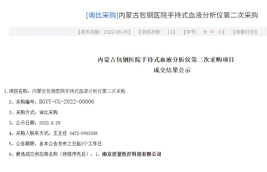 南京漢譽醫療近期就以雅培手持式血氣分析儀中標了內蒙古包鋼醫院手持式血液分析儀招標采購項目。