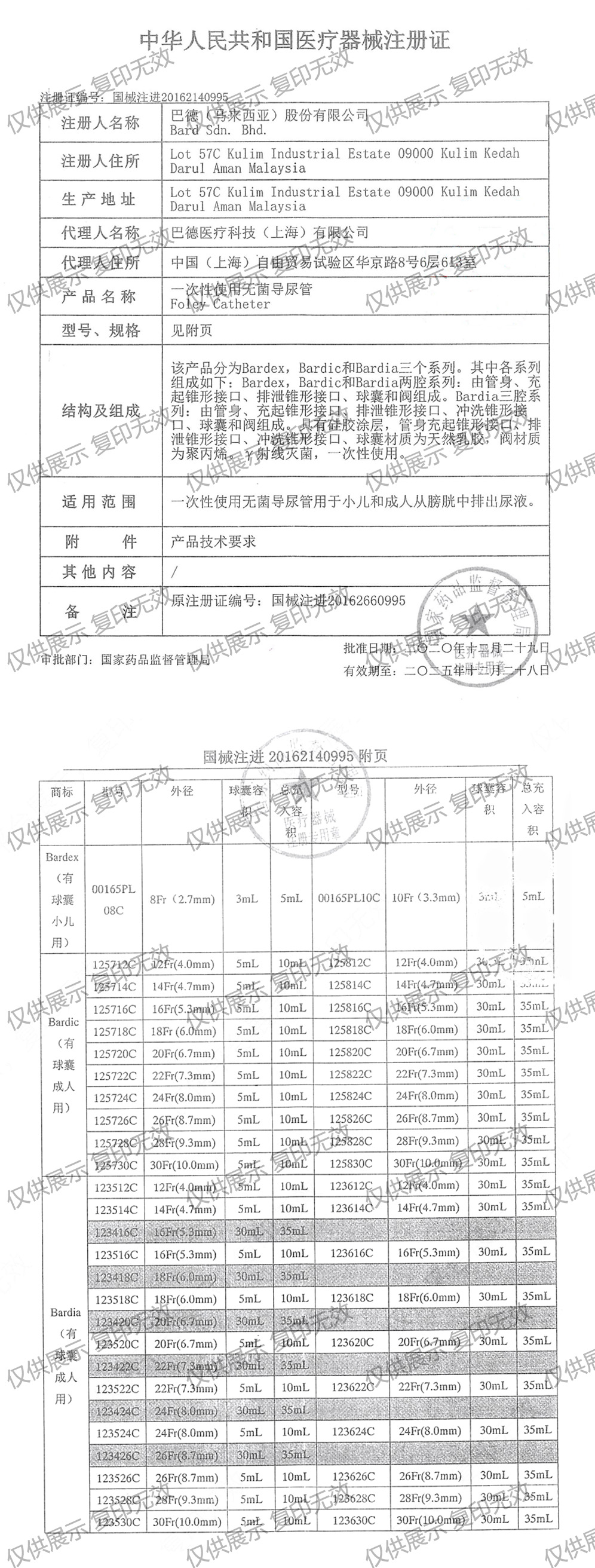 結構及組成:該產品分為Bardex,Bardic和Bardia三個系列。其中各系列組成如下:Bardex,Bardic和Bardia兩腔系列:由管身、充起錐形接口、排泄錐形接口、球囊和閥組成。Bardia三腔系列:由管身、充起錐形接口、排泄錐形接口、沖洗錐形接口、球囊和閥組成。一次性使用。