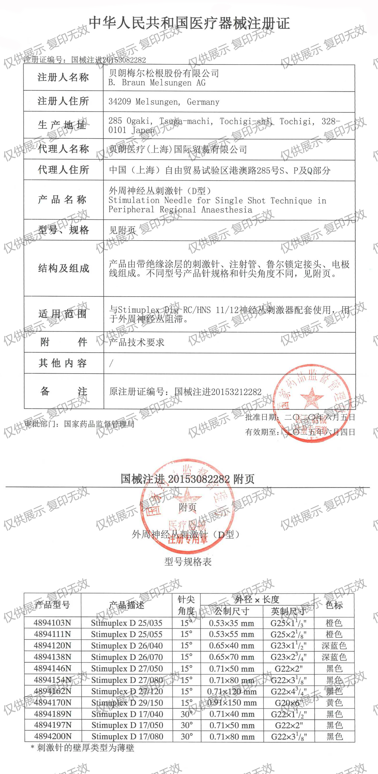 適用范圍:與Stimuplex Dig RC/HNS 11/12神經叢刺激器配套使用,用于外周神經叢阻滯。
