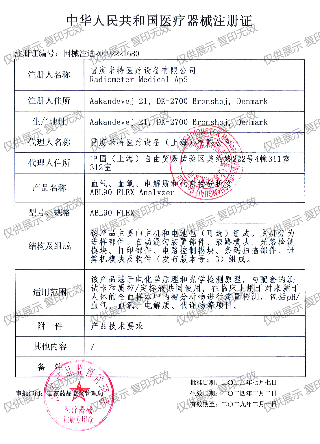 適用范圍/預期用途:該產(chǎn)品基于電化學原理和光學檢測原理,與配套的測試卡和質(zhì)控/定標液共同使用,在臨床上用于對來源于人體的全血樣本中的被分析物進行定量檢測,包括pH/血氣、血氧、電解質(zhì)、代謝物等項目。