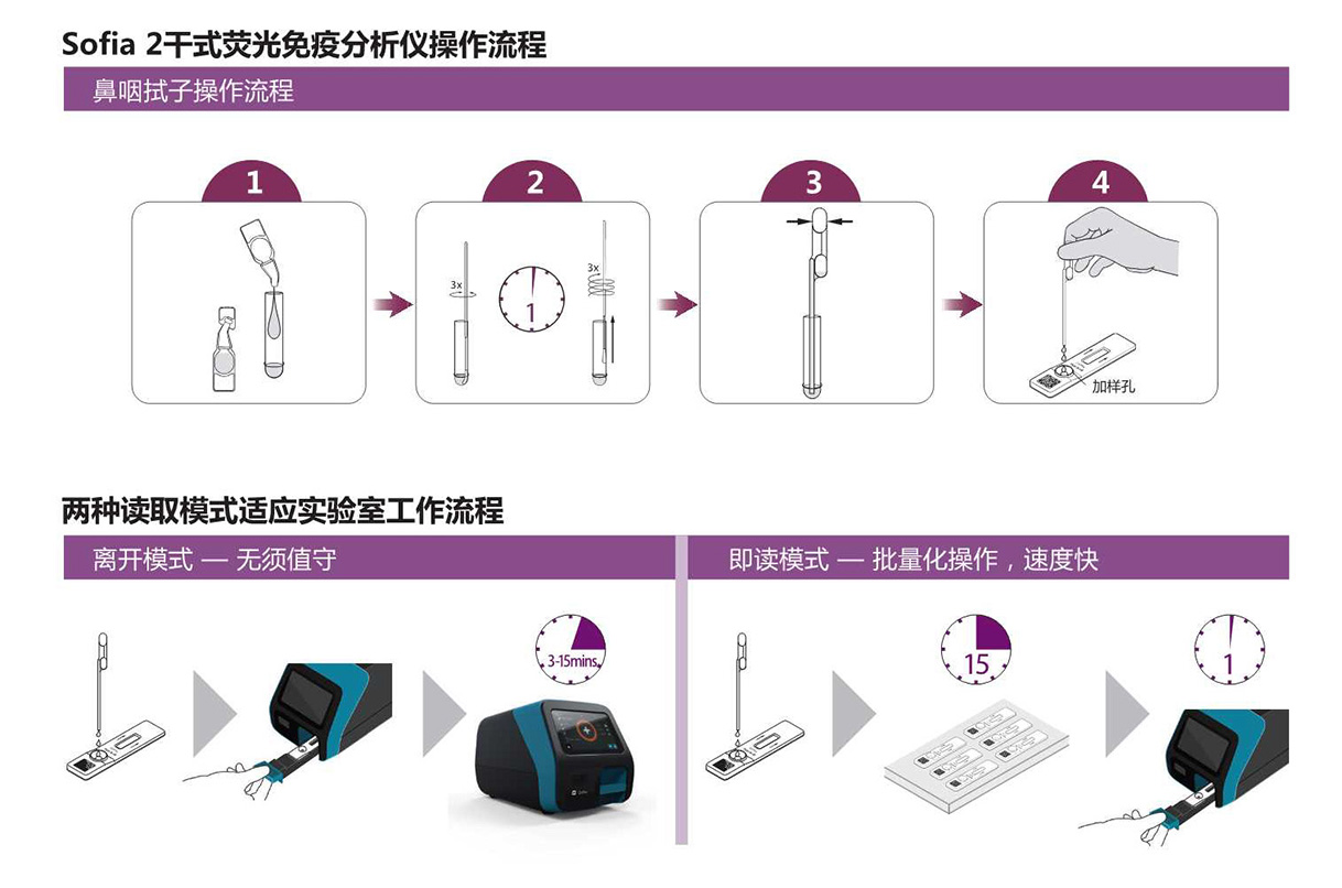 適用范圍:該產品采用免疫熒光法,與配套的檢測試劑共同使用,在臨床上用于對來源于人體的鼻咽拭子樣本進行病毒抗原檢測。