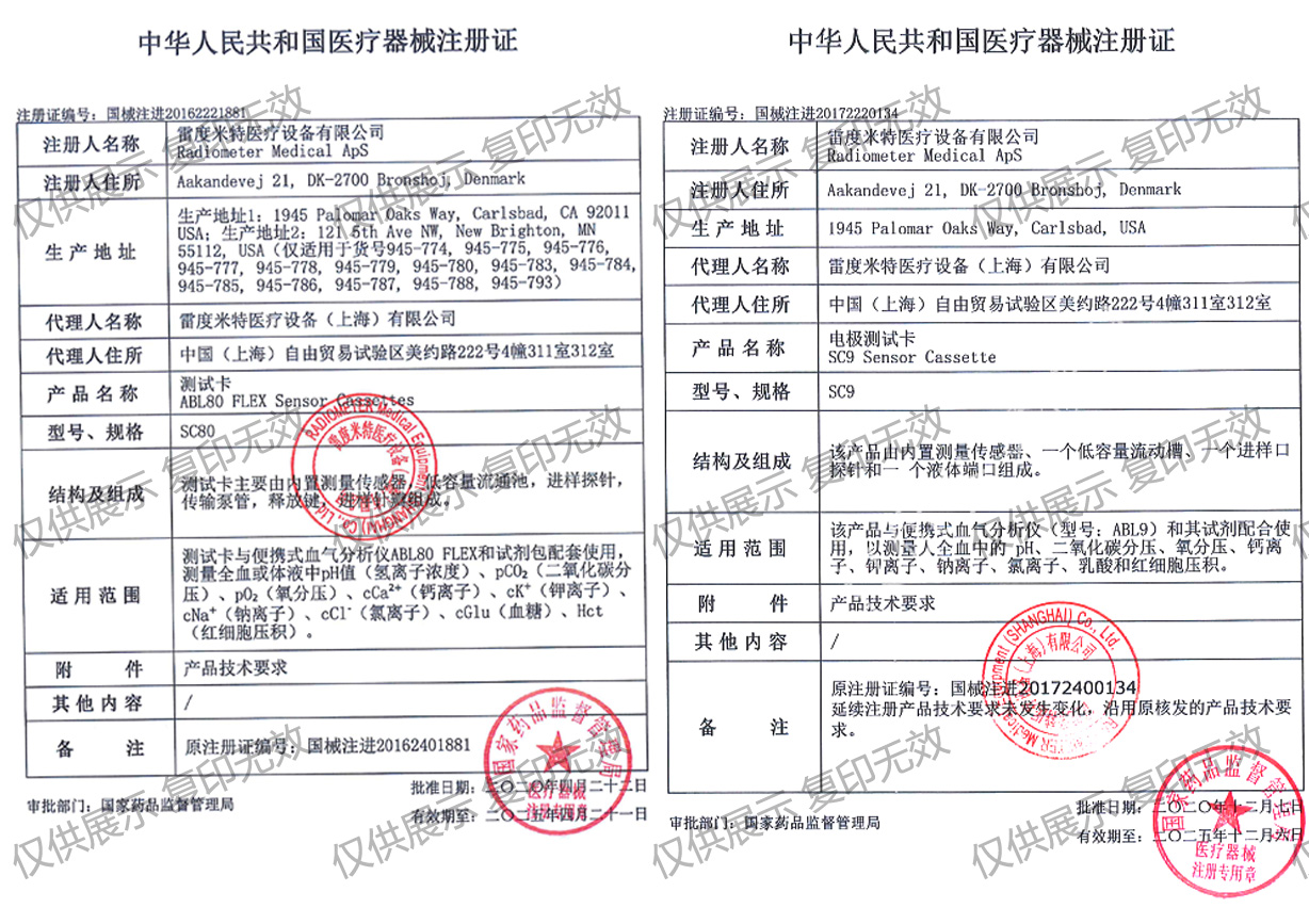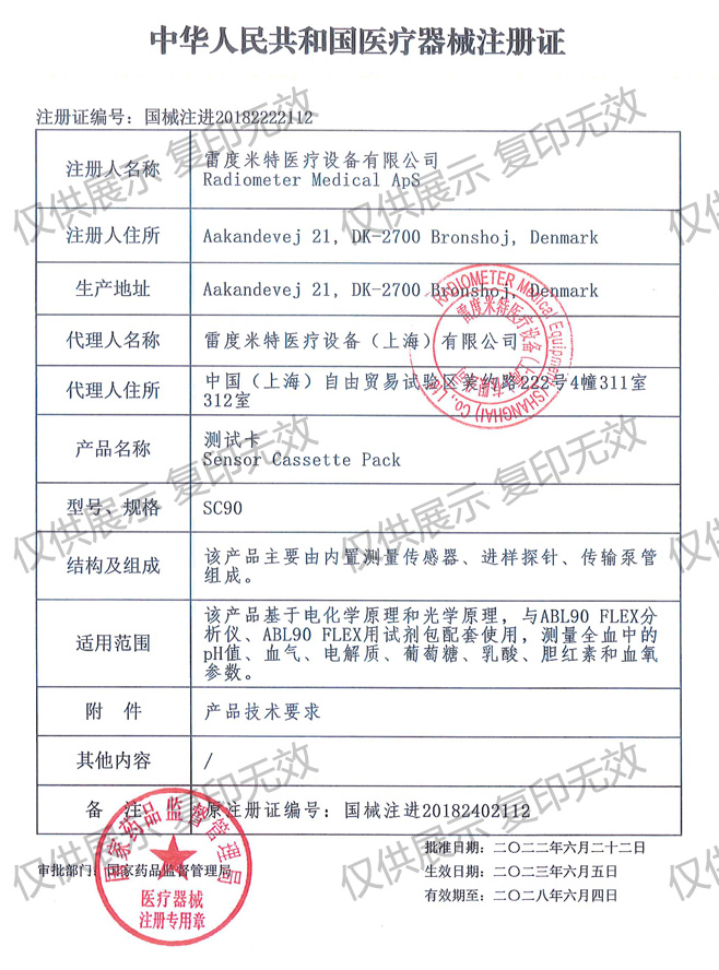 雷度ABL90血氣測試卡注冊證編號:國械注進20182222112