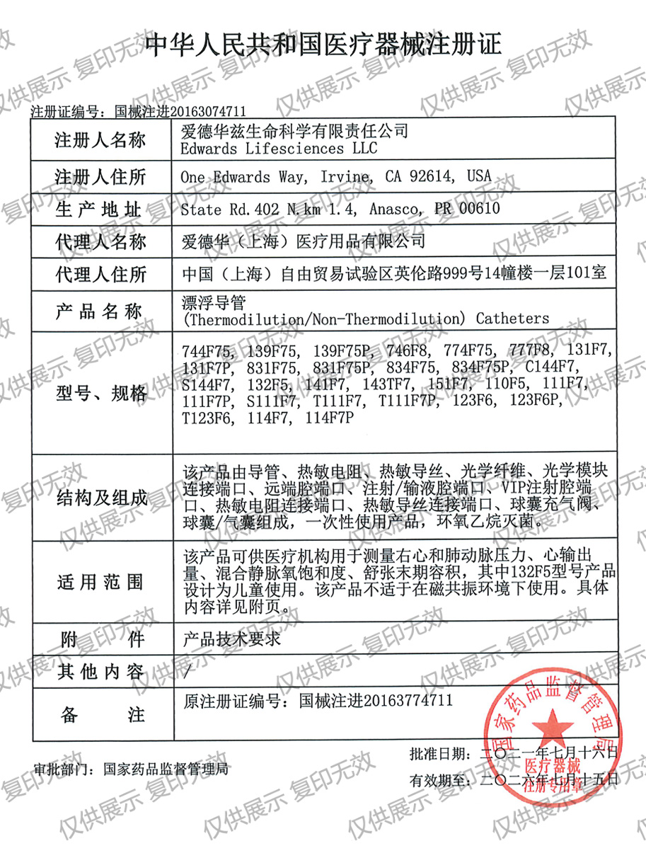 適用范圍:該產(chǎn)品可供醫(yī)療機(jī)構(gòu)用于測量右心和肺動脈壓力、心輸出量、混合靜脈氧飽和度、舒張末期容積,其中132F5型號產(chǎn)品設(shè)計(jì)為兒童使用。該產(chǎn)品不適于在磁共振環(huán)境下使用。