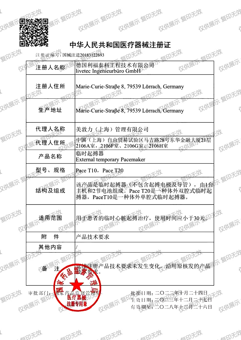 適用范圍:用于患者的臨時心臟起搏治療,使用時間應小于30天。