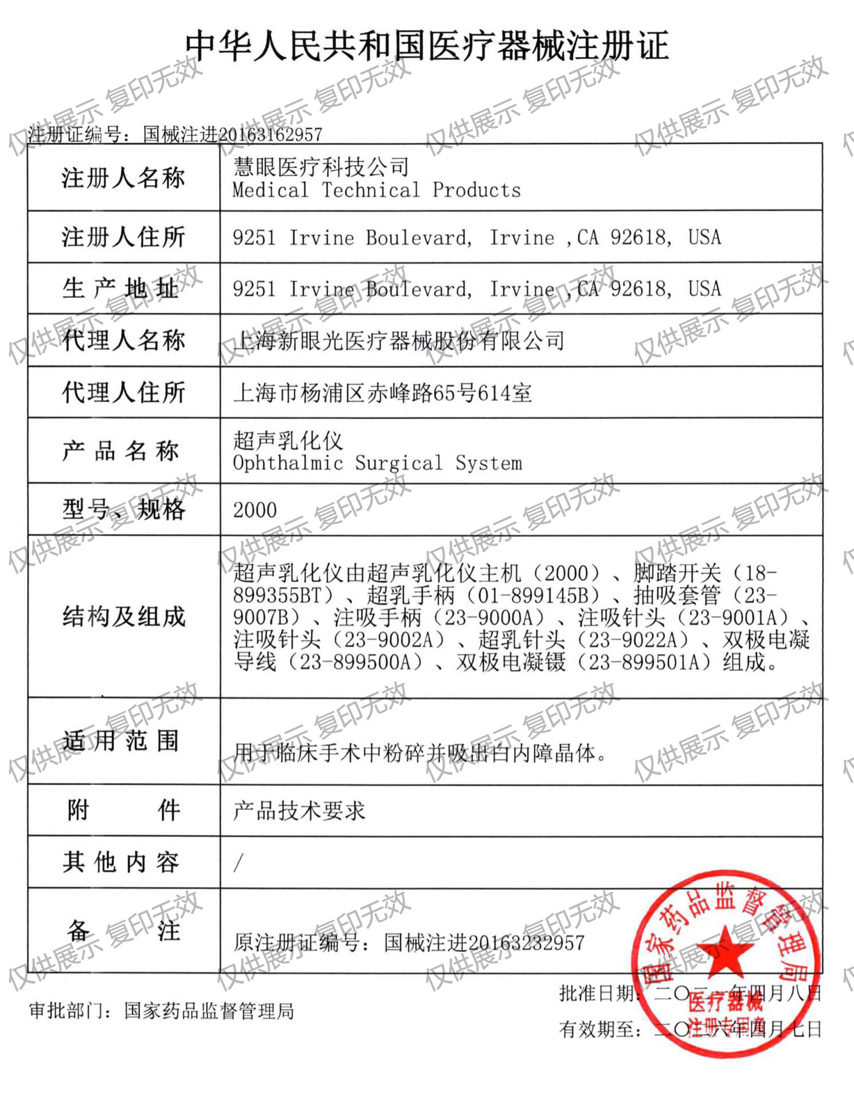 適用范圍:用于臨床手術中粉碎并吸出白內障晶體。